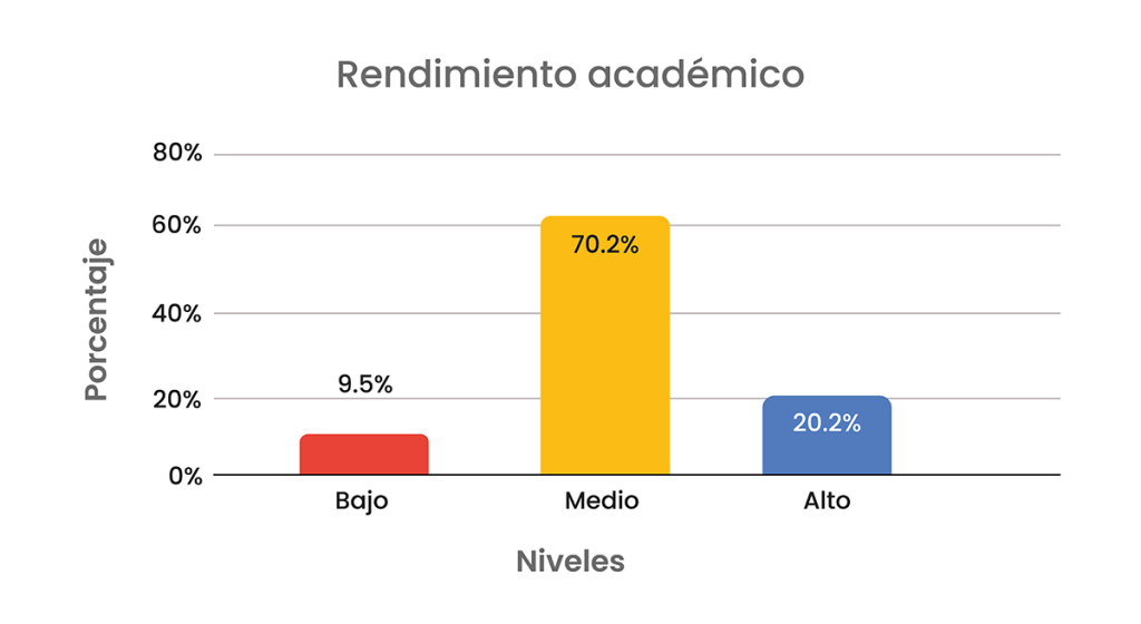 The school performance variable bar graph shows the academic performance dimension, we can conclude that students perceive themselves to be at an intermediate academic level, as confirmed by 70.2%, a percentage higher than the average, while 20.2% perceive themselves to be at a high level and, consequently, 9.5% are inferred to be at a low level.