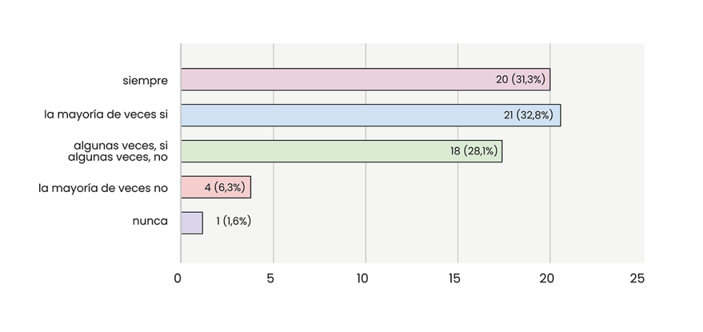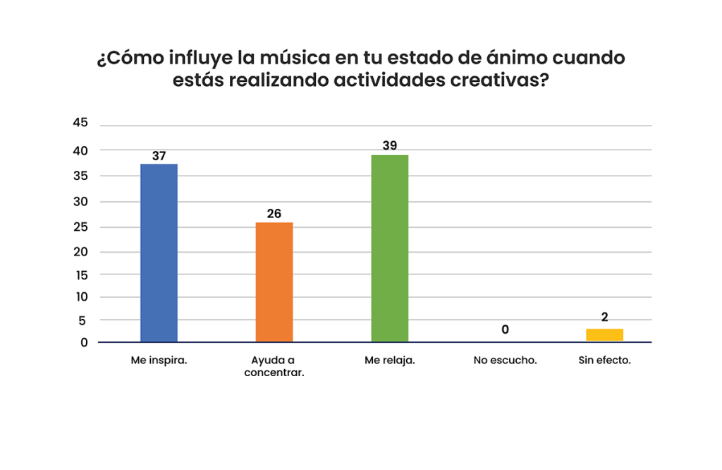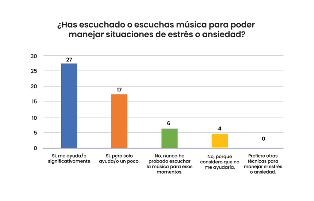 La mitad de encuestados, 27 (50%) estudiantes, afirman que usan la música como herramienta para manejar momentos de estrés y ansiedad, mientras que 17(31,5%) considera lo mismo, pero en menor medida y finalmente 10 (18,5%) nunca consideraron en usar la música como método de ayuda en momentos de ansiedad.