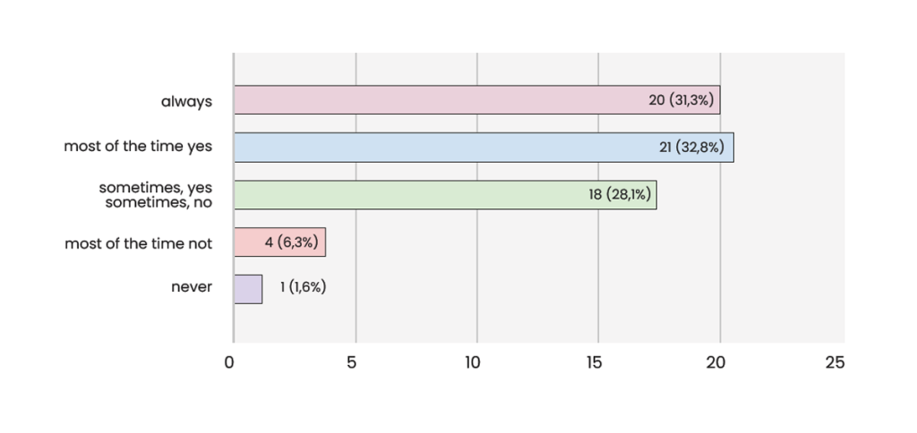 Does emotional exhaustion caused by academic stress make you tired? 21 people answer most of the time, yes; 20 people say that always; 18 people say that sometimes yes, sometimes no; 4 people say that most of the time no; and 1 person says never. We can infer that the vast majority of people/students agrees that emotional exhaustion is caused by academic stress, while a smaller number says no.