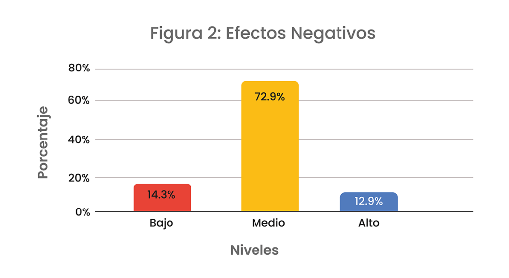 En la figura 2, se puede apreciar un nivel de efectos negativos evidenciable en la mayoría, donde sólo un 14.3% muestra un cambio nulo. Un 72.9% de los encuestados respondieron a haber tenido un cambio considerable en estas consecuencias, mientras que el 12.9% dio a conocer que su cambio se hizo bastante evidente.