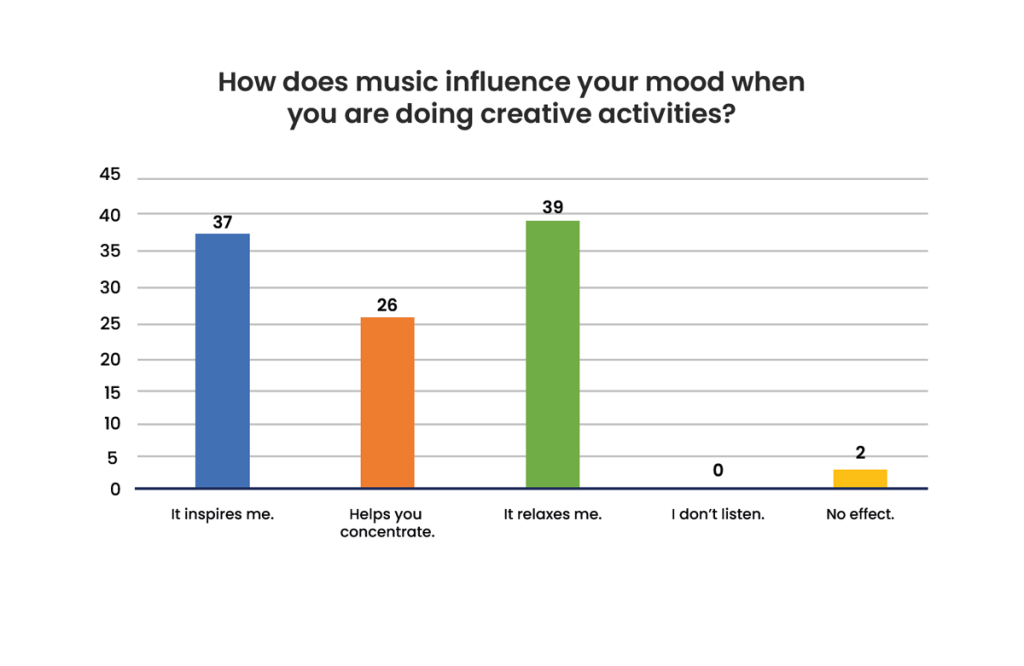 From the survey, 37 teenagers (68.5%) consider that the music they listen influences their current mood, improving it considerably, while 10 (18.5%) consider that it only makes them happy, which shows how influential music can be. For 5 (9.3%), it makes them feel nostalgic, for 2 (3.7%) it has no effect on their mood, and finally, none of the respondents believe that music worsens their mood.