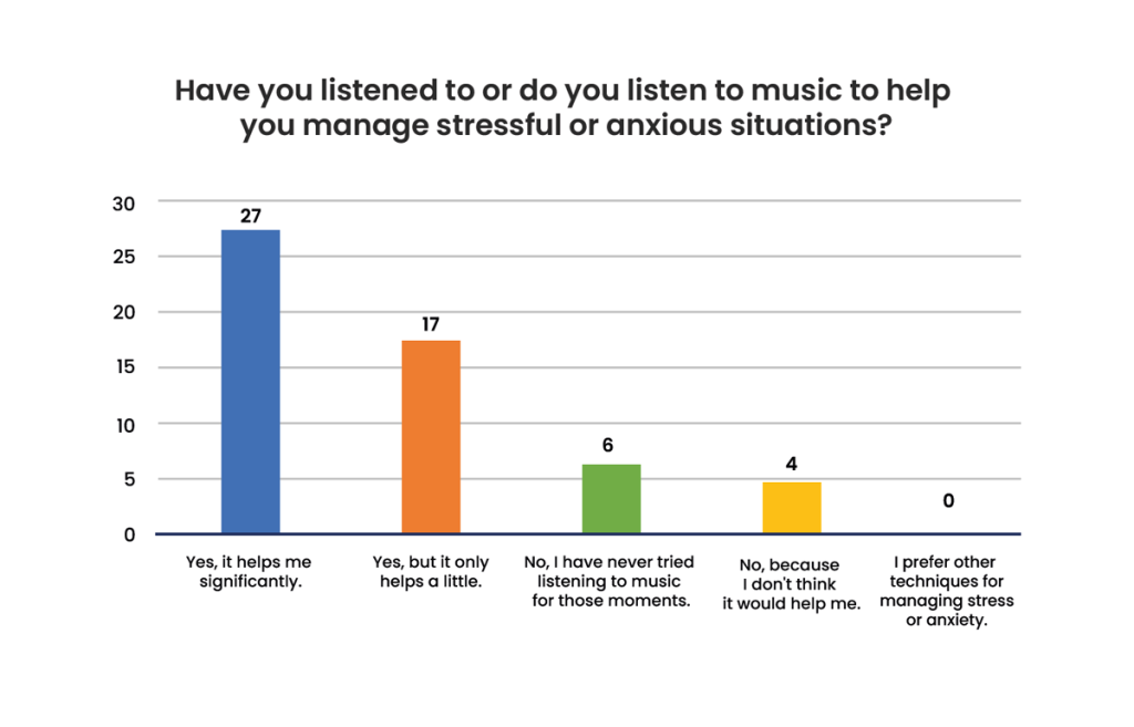 Half of the respondents, 27 (50%) students, say they use music as a tool to manage moments of stress and anxiety, while 17 (31.5%) consider the same, but in a less extent, and finally 10 (18.5%) never considered using music as a method of help in moments of anxiety.