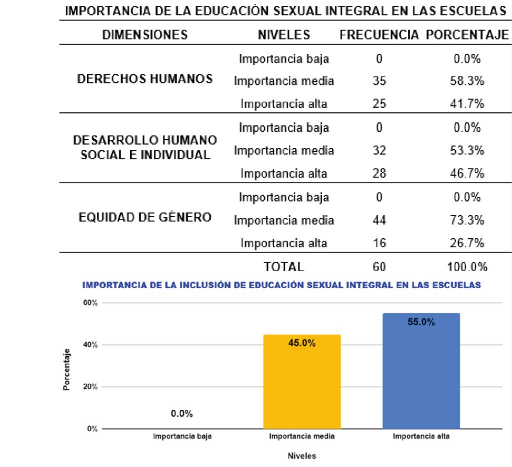 Por otro lado, el estudio permite conocer que los adolescentes valoran como muy importante que las escuelas a nivel nacional incluyan temas de educación sexual como parte de la currícula escolar dado lo necesario que se ha convertido en estos tiempos y contexto la revisión de información confiable, certera y de carácter formativo, incluyéndose en este estudio un enfoque desde los derechos humanos, el desarrollo humano social e individual, así como la valoración de la educación sexual que contemple la equidad de género.