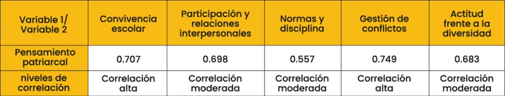 Los resultados obtenidos muestran la percepción de adolescentes de una escuela privada de lima acerca del pensamiento patriarcal y la convivencia escolar, en el que refieren la existencia de un nivel medio de ideas patriarcales en su entorno y un nivel medio y bueno de convivencia escolar saludable. Mediante la prueba de pearson de comprobó que existe una correlación alta entre ambas variables.