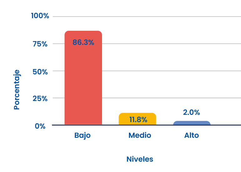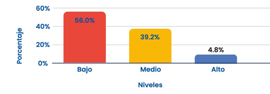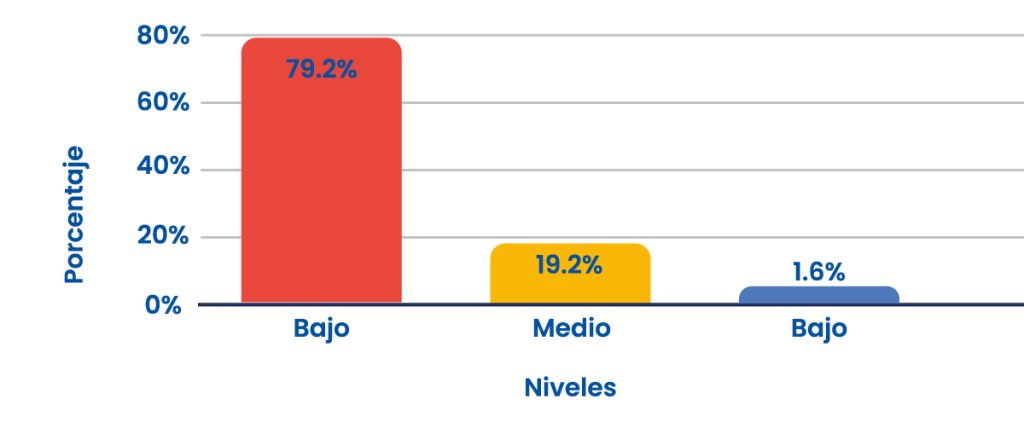 Figura 3, se habló sobre las consecuencias que ocasiona la adicción a los videojuegos como la falta de sueño, los problemas de visión, la falta de concentración, algún tipo de cambio psicológico y problemas al socializar. Luego se realizaron las respectivas preguntas para identificar qué cantidad de estudiantes presentaban estos efectos. Como se observó, la mayoría de respuestas fueron nivel bajo (79.2%), es decir, no los presentan, mientras solo el 1.6% presentan consecuencias de una posible adicción.