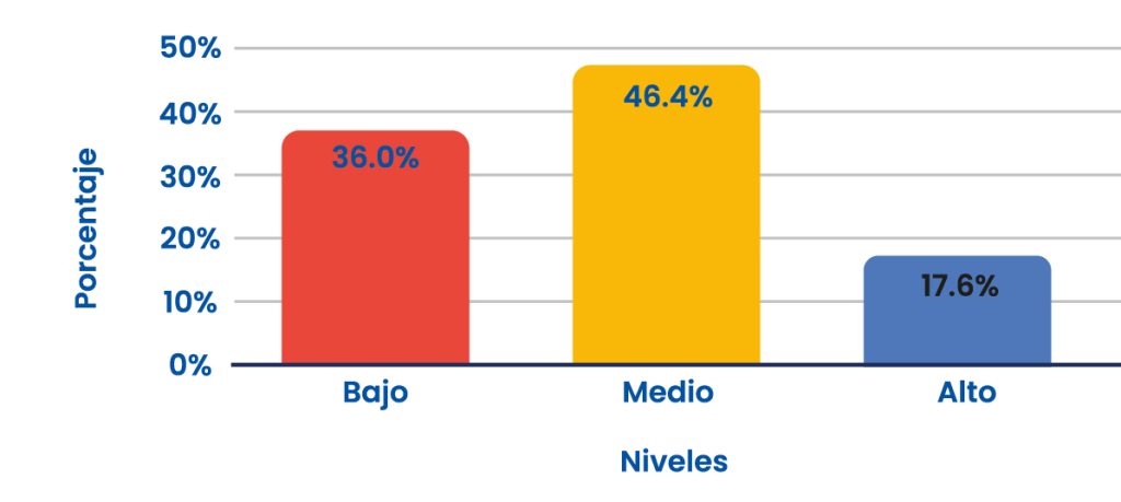 Obteniendo el mayor porcentaje en el intervalo “Medio” siendo en 46,4% que se considerará como videojuego violento debido a que presenta acciones violentas a pesar de que no sea en gran medida, seguido de “Bajo” con 36.0%, estos se consideran como videojuegos no violentos, y 17.6% confirman con totalidad la presencia de violencia en los videojuegos jugados.
