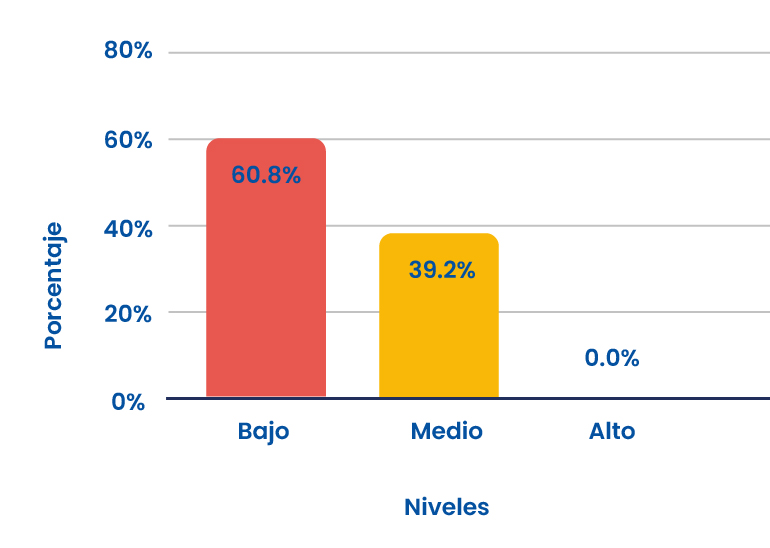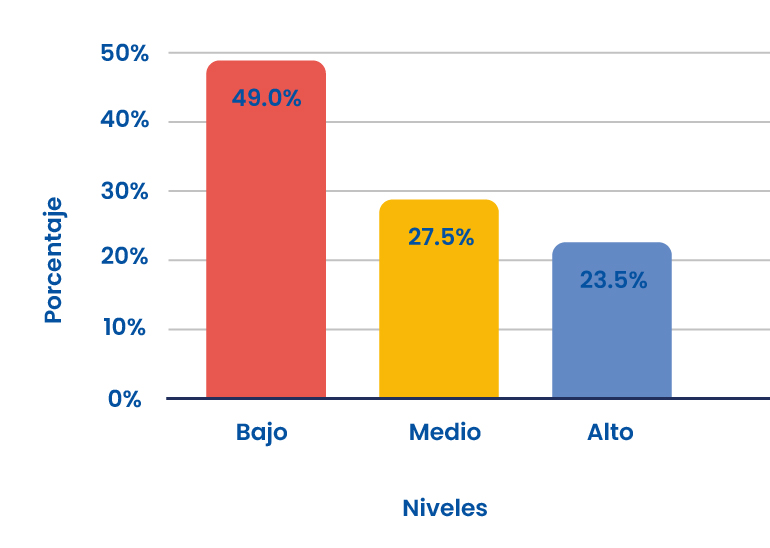 En relación con la tabla y figura 4 con la dimensión de baja autoestima, se obtuvo 25 de frecuencia en el nivel bajo con 49.0%, en el nivel medio se alcanzó 14 de frecuencia con 27.5% y en el nivel alto se obtuvo 12 de frecuencia con 23.5%.