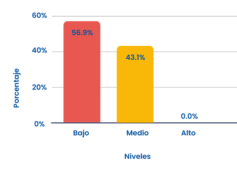 En la variable de ciberadicción se obtuvo 29 de frecuencia en el nivel bajo con un 56.9 %, en el nivel medio se obtuvo 22 de frecuencia con un 43.1% y finalmente en el nivel alto se obtuvo 0 de frecuencia con 0.0%. Los resultados indican que más de la mitad de las personas respondieron de manera que se les considera con bajo nivel en ciberadicción y 22 personas en nivel medio de ciberadicción.