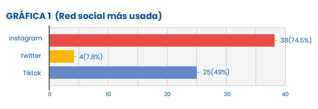 En el análisis univariado se obtuvieron los resultados divididos por indicadores (ciberadicción, ciberbullying y baja autoestima) y por niveles (bajo, medio y alto) para medir el efecto negativo de las redes sociales en la población encuestada conformada por 51 adolescentes del colegio Bertolt Brecht en Carabayllo. En estos resultados se obtiene que la mayoría de personas encuestadas (38 personas) usan más Instagram, por lo tanto esta red social es la más utilizada.