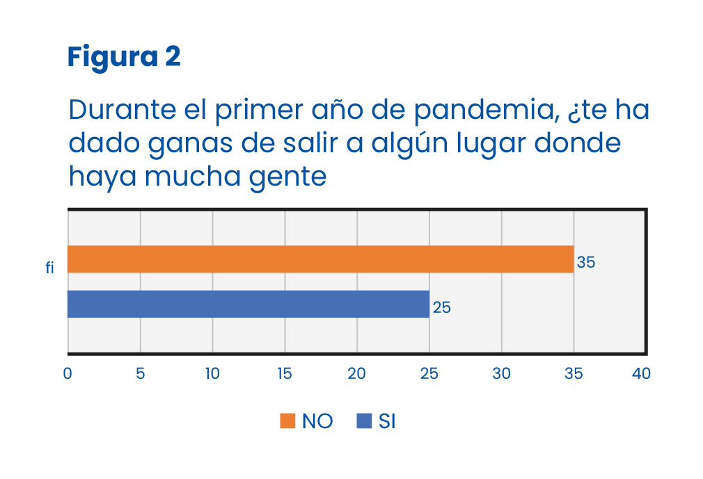 Junto a esto se sumó el desinterés de los jóvenes en salir, más del 50% deseaba no ir a lugares concurridos, por el contrario el 42% si deseaba salir. Durante el confinamiento muchas de las personas que solían ser extrovertidas, se volvieron introvertidas, dejando de lado su círculo social como la reuniones o fiestas, debido a la decadencia de su salud emocional y adoptando un nuevo estilo de vida creando nuevas conductas como el estar acostumbrado a estar solo en lugares con poca gente, sin embargo la rutina es agotadora y el estar solo para algunos también lo es, se necesita del contacto con otras personas, estar en lugares llenos de gente donde puedan sentirse cómodos. (Figura 2)