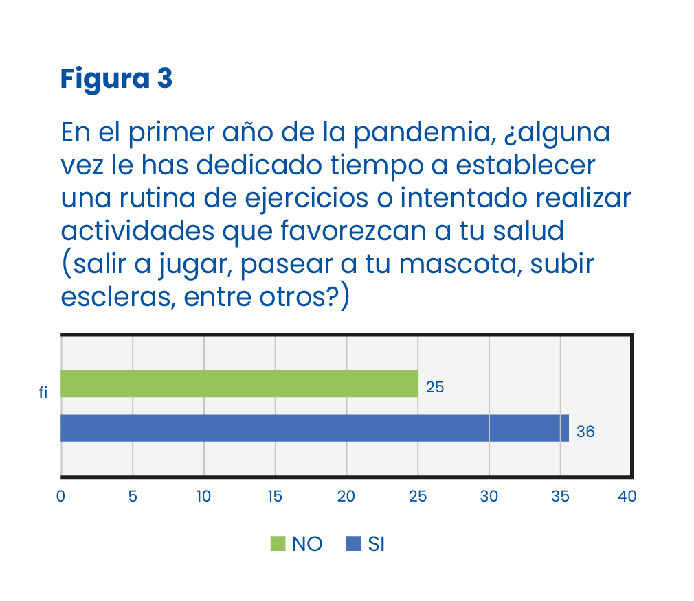 Por otro lado, más del 50% de personas respondió que sí realizó ejercicios adaptados a su vida cotidiana. De este modo, se concluye que muchos de ellos encontraron en el ejercicio un modo de seguir manteniendo una mejor de salud física que ayude a la salud mental, contribuyendo a contrarrestar los efectos de la pandemia por la segregación de hormonas como la endorfina y la serotonina. (Figura 3)