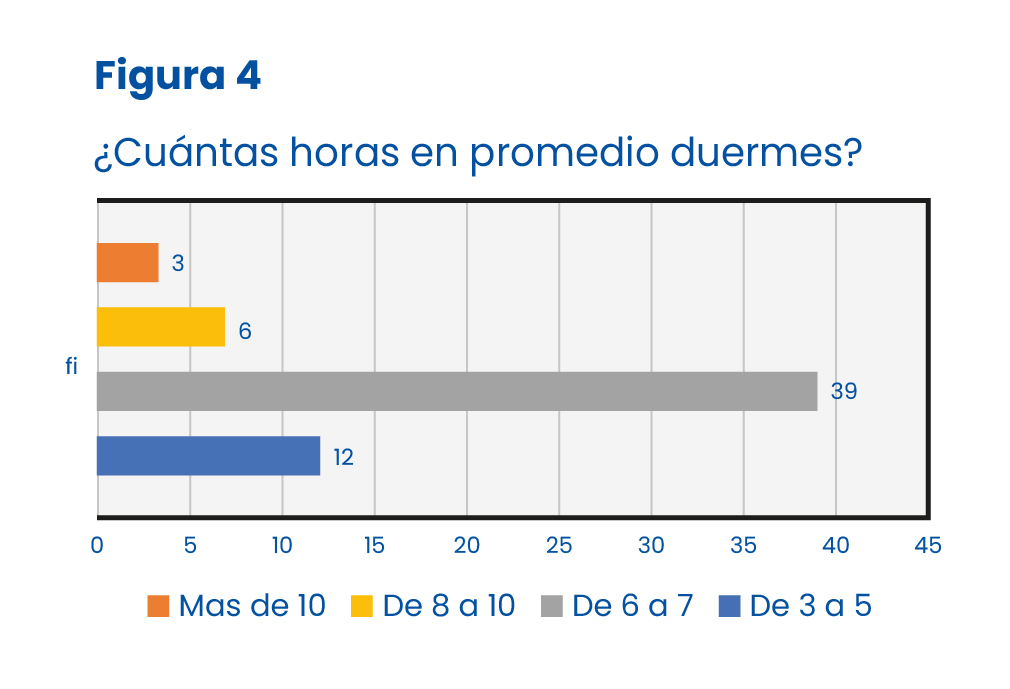 De la misma manera, más de la mitad (85%) de los encuestados respondieron que duermen menos de 7 horas, siendo menor al promedio de horas que debe dormir un adolescente. En cambio, un 15% de encuestados que respondieron que duermen más de 8 horas, demostrando que un bajo porcentaje de personas mantiene un “buen” hábito de sueño, sin embargo es importante recalcar que así como no podemos dormir poco, tampoco se tiene que exceder en las horas de sueño, lo más recomendable para esta edad es dormir hasta 10 horas, porque si no, se pueden generar dificultades en el desarrollo de las actividades cotidianas. (Figura 4).